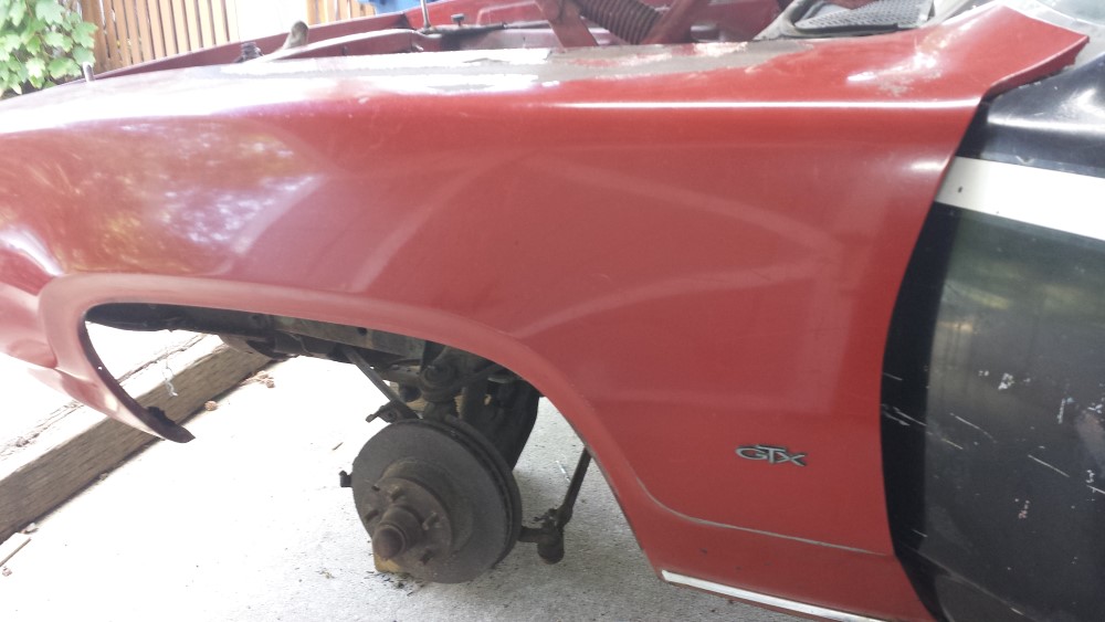 The passenger side fender is blue, plus it never had a GTX emblem on it. There are also signs of under paint rust bubbling on the passenger door, indicating possible body work back in the day, perhaps due to the accident that cost the car the fender. While removing the chrome trim on all of the wheel-wells, I noticed they were all screwed in except for the replacement fender, which had the chrome trim riveted in instead. Not sure if this identifies what kind of car it came from or not.