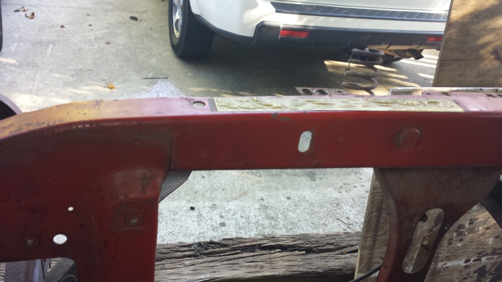 It may be difficult to see in the pic, but it looks pretty smooth on the area under the yellow pic As the radiator support curves down toward the driver's side headlight, I see a stamp marking. It's upside down, facing the firewall. It appears to have 3 numbers, then a letter, then 3 more numbers. There is something similar on the passenger side, but in a slightly different location and facing forward instead of toward the firewall.