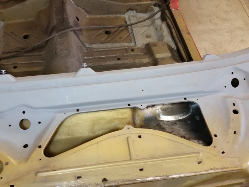 While the cowl area is exposed, I put some rust paint inside, to stop any more rust.It looks like there will be two patches in this area - one partially over top the other as it looked from the factory. Here's a partial start on the first patch.