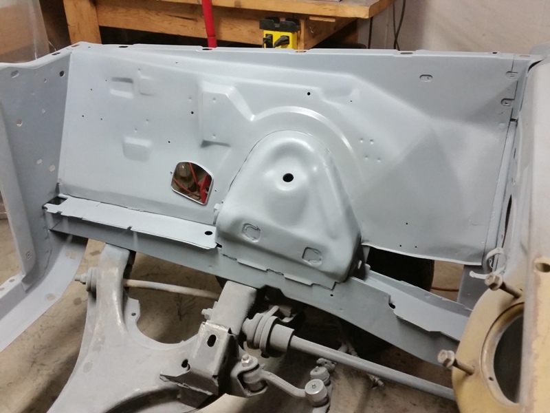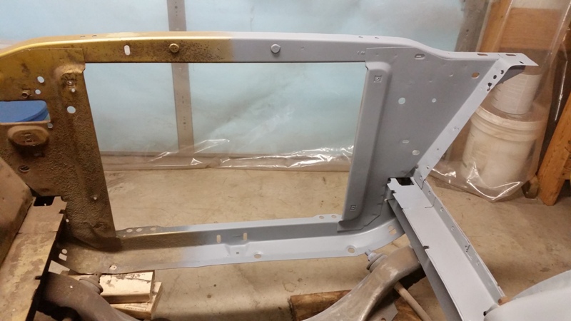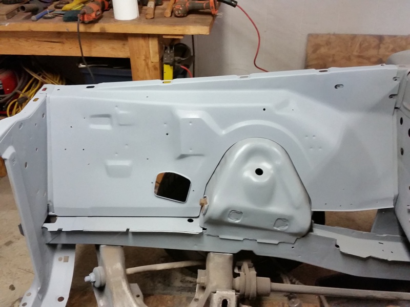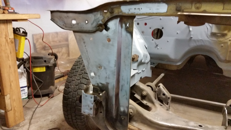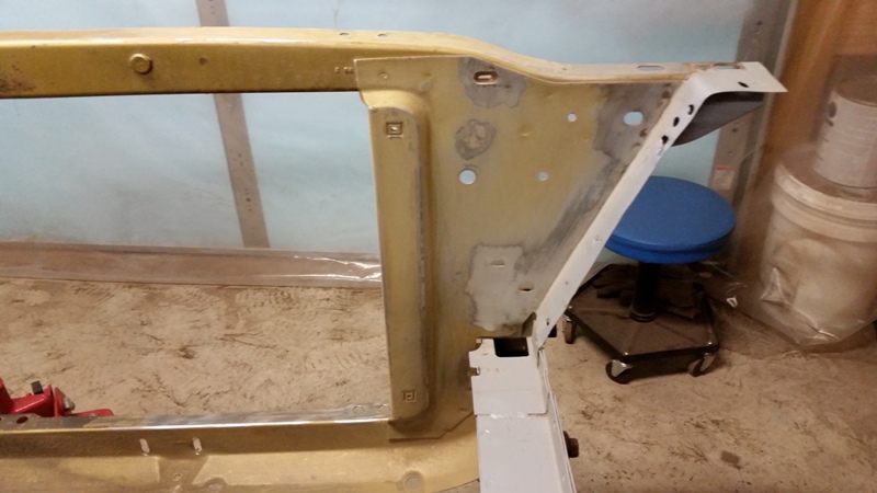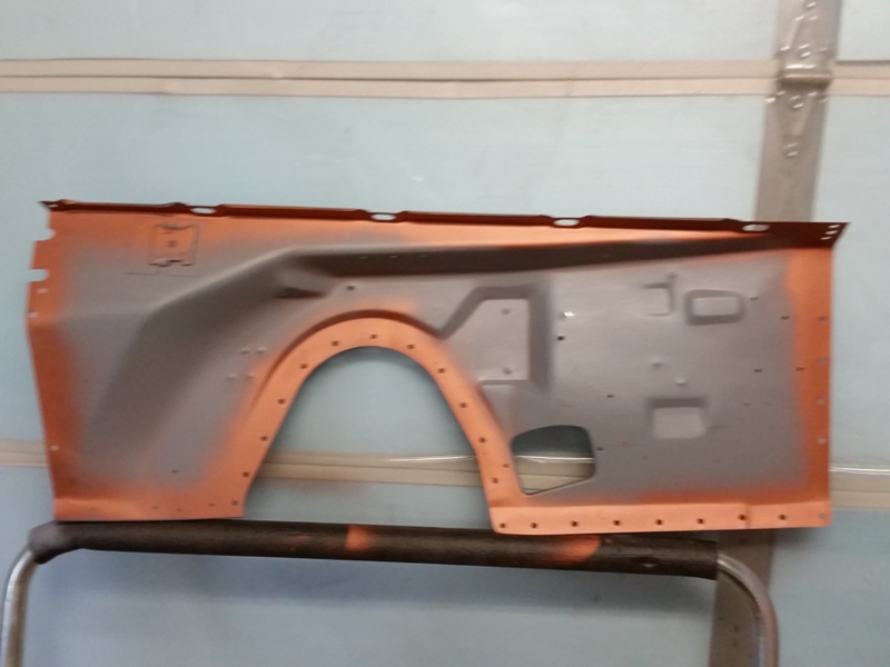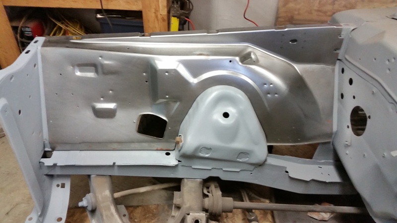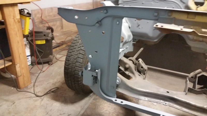 But, none the less, I was back at it today, finished cleaning up the passenger side of the rad support. Then put some primer on it.Finally I was able to start prepping the inner fender for that side. I got the reproduction inner fenders from Dales Cuda shop.
