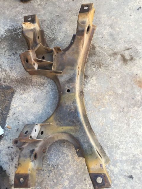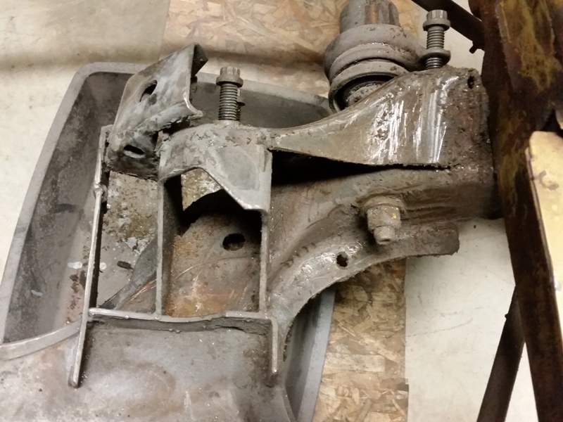 Here's a picture of a k-member I took from E-bay, see how the drivers side mount looks compared to mine. Now I have detached the lower brace as it's been shortened and doesn't go across the width of the mount. I'll have to fix that.