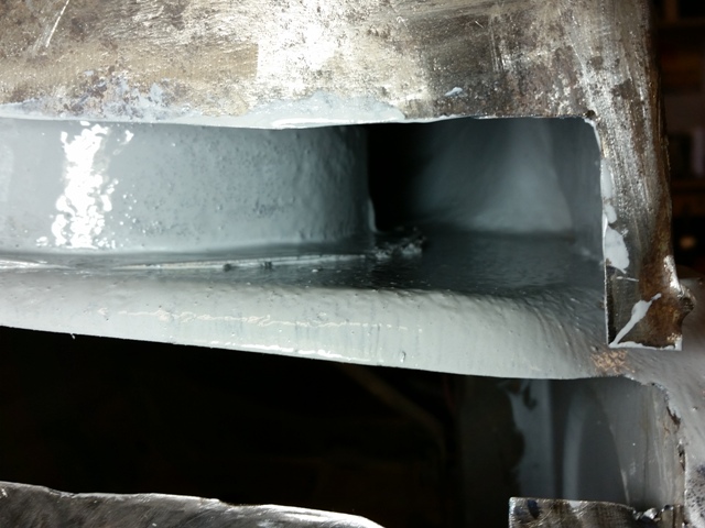 After scuffing the area down, I applied 2 coats of Rust Bullet. I did have to clean up the area on the drivers side where the reinforcement for the bracket that holds the steering column is located.