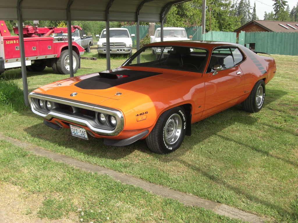 I am over in port angeles ,there is actually 4 - 72's in town here mine is 440 a/t ,my neighbor has a 340 4 speed ,and there are 2 400 a/t cars ,the 400 cars are ga4 gunmetal grey also ,the 340 car is hemi orange ,another friend of mine has a 71 gtx in black ,it has been off the road since the early 80's at least ,i think it has super low miles like 30k or so ,i have not seen that one for a while ,mine is the only n96 air grabber car out of the bunch though ,not sure if want the pics cluttering up your build ,if so maybe a mod can move them to the right type of thread ,last time i painted it ,the half vinyl top was not available through year one ,i have not looked lately maybe they make them now some reason my images are cut in half ?