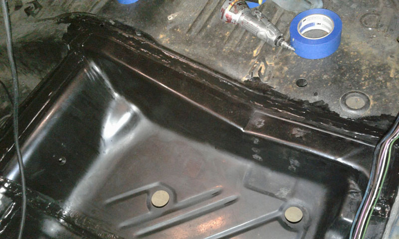Got everything cleaned up, coated with with POR15 where applicable, welded up holes from where spot welds had been drilled out, treated the frame rails with "interior frame rail coating", welded the new pans in after a lot of in-and-out fitment, hammering and trimming etc.