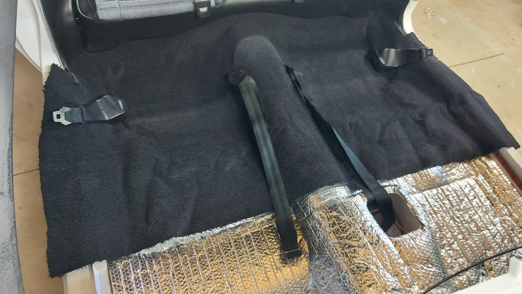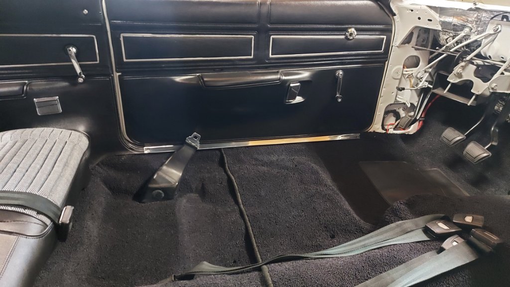 Even tho its in the high thirties in the garage today I managed to get the rear half of the carpet installed along with the back seat bottom. Hopefully when the warmer weather arrives it will relax the carpet, so it lays flatter.