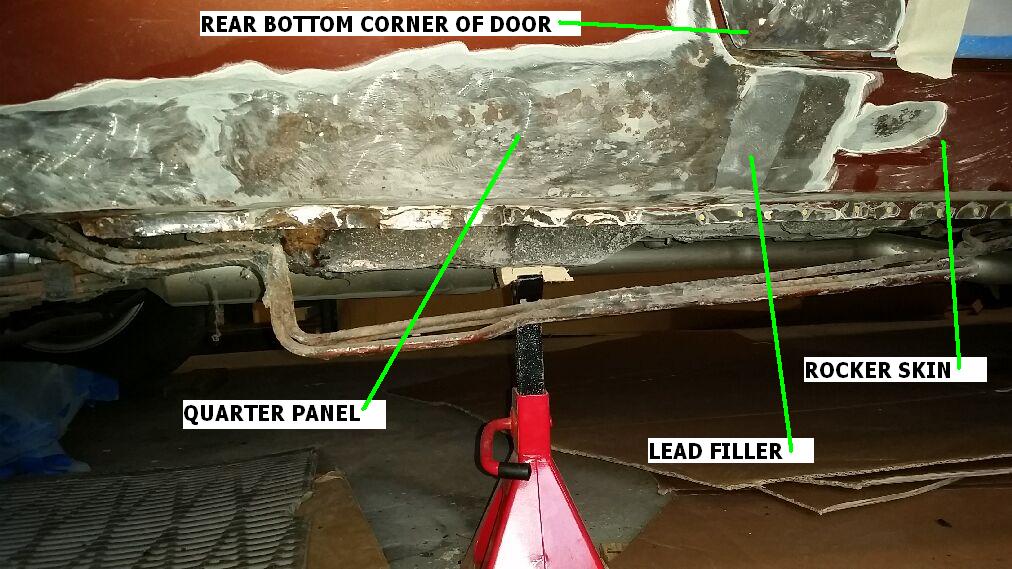 See the attached pics - what I'm thinking is that the area I call "interior" boxed structure which is hidden by the quarter, is actually part of the rocker skin / outer rocker. I think the outer rocker "dips" inward at the lead joint. This dip allows the receding flange on the quarter to butt up to the area on the rocker where it dips in. That's where the lead is laid in.