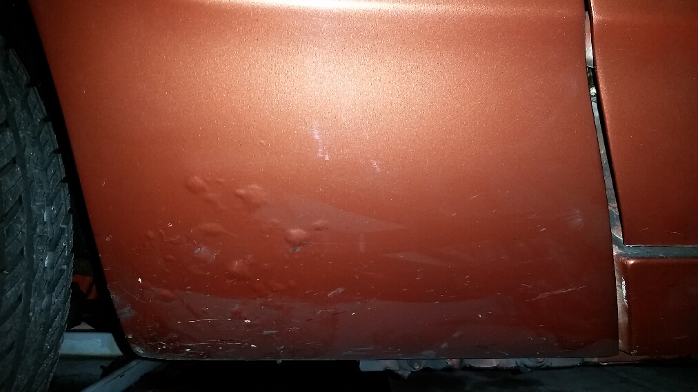 I bought this numbers-matching, no-fender-tag-or-build-sheets 71 GTX in late 2012, knowing it was going to be a project even though it was drivable and running (poorly). It had very visible blistering of painted bondo between the wheel wells on the quarters, rockers, doors, and the left fender. A friend had said he would do the body work before I decided to buy it, but I could never get him to do it. After 4 years of other tweaks and repairs, etc. I decided to attempt to do the sheet metal patching or replacement myself. Naturally, things are worse than they appeared to be before I started grinding away paint and bondo around the blisters.