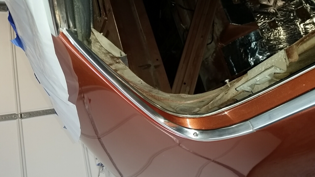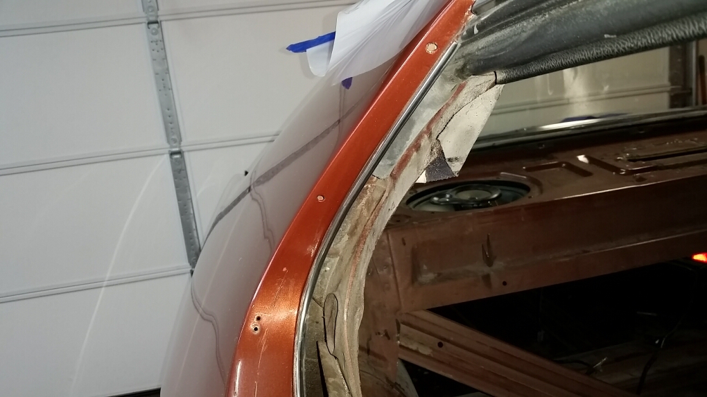 The rear glass moldings are held in by a clip that is installed onto studs around the reveal. These studs look like the top 1/8 inch of a 4 penny common nail. Some were missing, and the clips were screwed on instead. I couldn't get the screws out with a screwdriver. Note that the new AMD quarters don't have these studs, so unless I want to try to make studs and weld them in from behind, I'll have to use screws anyway.