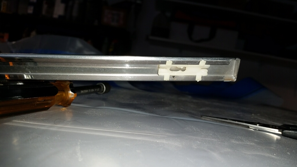 There are tools available to release the moldings from the clips, and I watched some youtube video, then decided to try to use a right-angled pick scribe, which is hardened tool steel. With a little fiddling around, you get the point in behind the clip at the upper end, pull it away from the reveal, and the molding pops up.