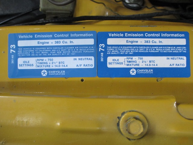 What color were the vehicle emission decals on a 1971 roadrunner 383 auto, green or blue? I took mine off during the restoration and the picture I have the label looks to be green. However, the one that I bought from ECS is Blue # 3614873.