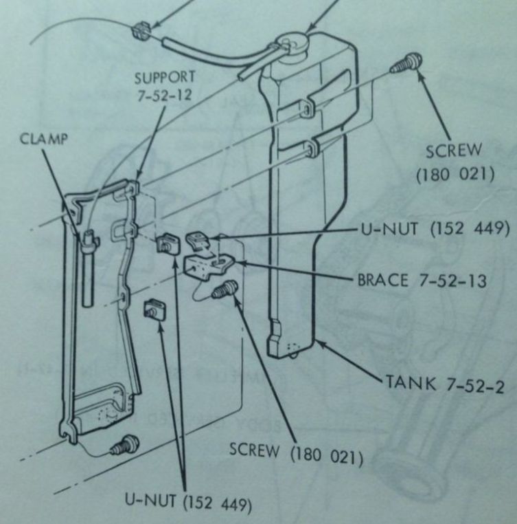 Gentlemen - I seek you assistance yet one more time. I think this photo of a radiator overflow reservoir applies to 73-74 E-bodies(?) but will be installing the reservoir and bracket in my 71 Satellite. There is missing detail pertaining to the brace that I am interested in. Can anyone provide the entire drawing?