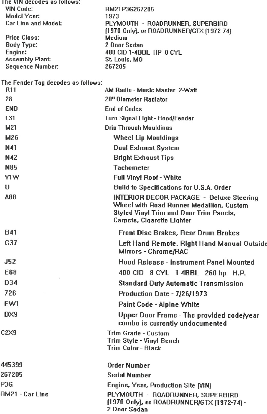 - My Cars: 73 Plymouth Roadrunner, 400/727/3.23 originally