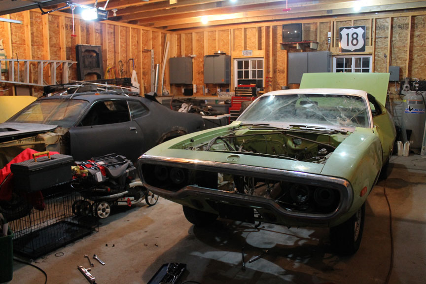 Here's my mess... Black/primer one is my '71 340 car. Green one is a '72 340 parts car for the '71. I'm stripping that one down right now, keeping what I need for the '71, and selling what I don't need to start funding the project car. Hopefully I have it on the road before my kids are out of the house (they're 4, 2 and 6 months) :lol: