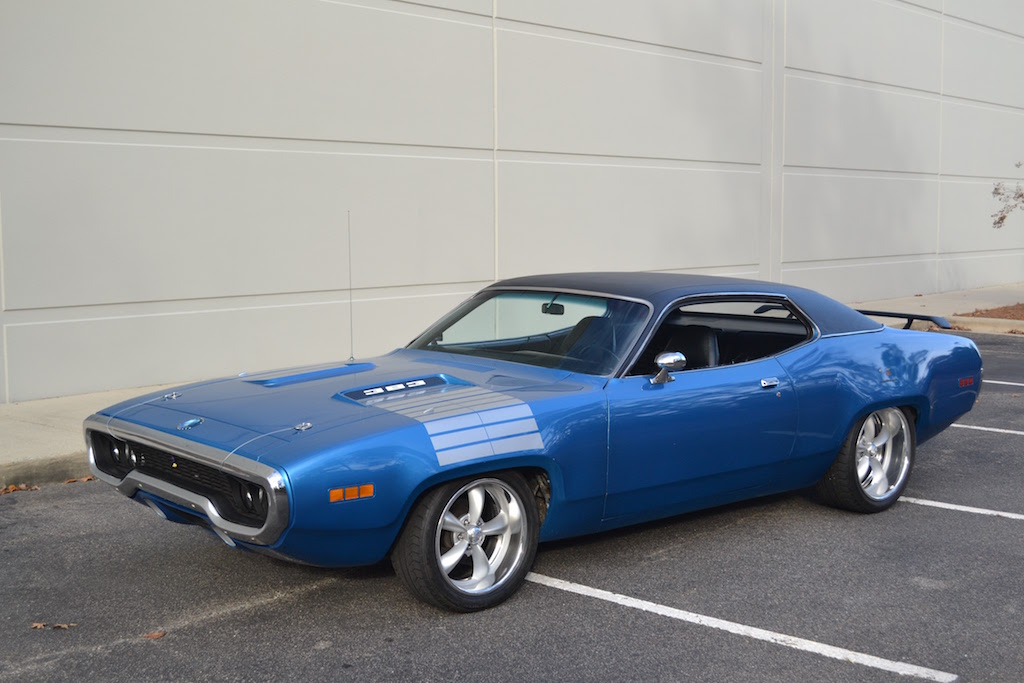 This is the second 1972 Road Runner that I have restored. This one is Basin street blue as the other one (pictured above at almost the top of this page-with magnum 500's) but this one has a 68-70 B-body dana to keep the 295-50-15's under the wheel wells with a 4-speed behind the 451 with early stage 6 heads with a CH-28 dual four barrel intake.Car is awsume!