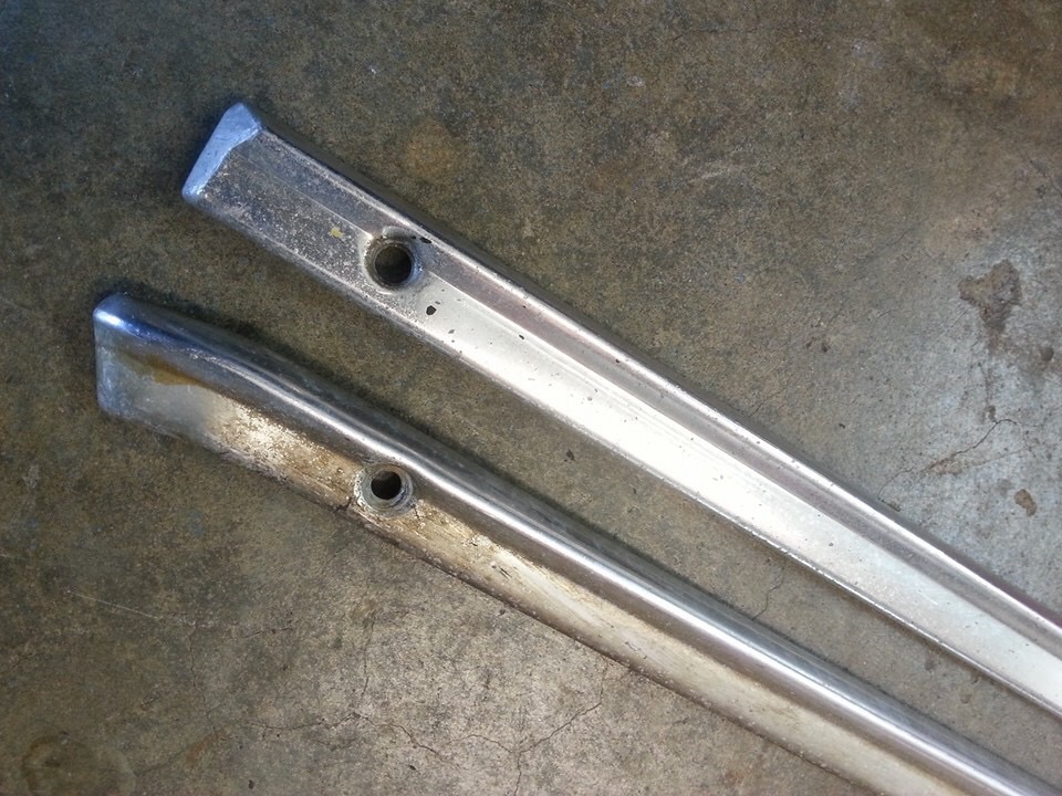 I forgot to mention that this car is a Sebring and not a SSP. 81-1/2" is perfect for one of these. The other with the curled ends looks like the NOS Charger moldings currently listed In about 4 or 5 ads on eBay right now.